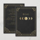 A refined vertical Art Deco details card featuring celestial gold accents, moon‑phase inspired geometry, and a dramatic black backdrop. Designed for modern weddings with a luxurious vintage aesthetic, this card presents event information with clarity, elegance, and cohesive celestial styling. Please note: not real gold or gold foil.