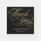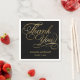 En bröllop-napkin med en svart bakgrund med ord "Tack" i faux-guld folie och utrymme för namn och bröllop för briden och trimningen.