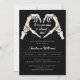 Black Gothic Kärlek Halloween Baby Shower-inbjudan. Den minimalistiska Halloween-kallelsen till babyduschen med handmålat vattenfärgat handskelett i form av ett hjärta, kalligrafi och enkel ren design. Svart bakgrund framför och bakom. Du kan anpassa texten, teckensnittet stil, färg och storlekt framför och bakom inbjudan.