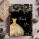 Ett feminin- och elegant födelsedagstack. En svart bakgrund med faux guld glitter, gnistor, svart ro och en gyllene klänning. På framsidan finns ett skript med stora bokstäver och texten: Tack. Tillbaka: Anpassa och lägg till tackkort och namn. Namn är skrivet med ett modernt handskript i stil.