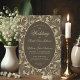 Elegant bröllop-inbjudan med vintage luft har en vintage guldfärgad ram med spiralande guld thistle löv och ett par thistle blommor dekorationer mot svart bakgrund. Texten är i en ovala med guldgräns. Ord Bröllop och namn i bruden och brudgummen skrivs i ett kalligrafiskt skript för elegant. All text kan vara personlig och ha ett gyllene färg som liknar dekorationerna guld i ram. Bakgrunden med sina elegant guld thistle-dekorationer kommer från en vintage bok-täckmantel som av Albert Angus Turbayne är bindande för bok "Damen om Sjö" av Herr Walter Scott, som offentliggjordes 1898.