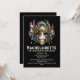 Ansikte på en vacker kvinna med porslinvit hud och röd läppar har hennes mörk kol grått-hår som tränger in i ansikte med mjuka klämmor. Hon bär en ornatsvart mask och guld venetianska ansikte som har lila fjädrar i mörk på det övre yttre kanten. Hon ställs mot en svart bakgrund som gör att hon kan hoppa. Den här eleganten är en vattenfärgsgrafik som är perfekt för en bachelorette, födelsedagspresent, sweet sixteen eller quinceanera party. Anpassa bara de redigerbara textmallarna till kostym vid ditt speciella tillfälle.