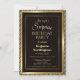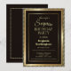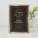 En modern 18:e födelsedagsfest inbjudan-överraskning med guld gräns i ett guld, utsmyckat diagonalt stripat ram mot svart bakgrund.