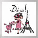 Diva T-shirts, dykostymer, mugg, påsar, kort, klistermärken, nyckelringar, kuddar, väggklockar och mycket mer med en söt diva-design som visar en svart smidd flicka i en hatt och rosa klänning med hennes rosa pudel nära Eiffel Torn!