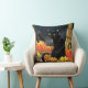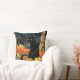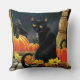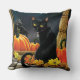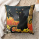 En svart katt sitter i en dörr med pumpor, lanternor, broomstick, höst löv och en fullt-skörd måne bakom.