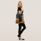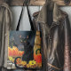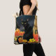 En svart katt sitter i en dörr med pumpor, lanternor, broomstick, höst löv och en fullt-skörd måne bakom.