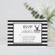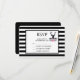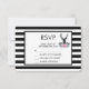 Bröllop eller annan OSA kort med svart hjort med stora antlers. Geometriskt linjer i hjortens ansikte ger en kreativ beröring. Färgblommor och löv av mynta rosa bildar en söt blommigt bouquet under hans huvud. En skiss av bergsområden som är placerad bland blommorna ökar också känslan hos land. Bakgrunden är ett svartvitt strimlat mönster.