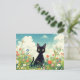 This heartwarming design features an incredibly sweet black kitten with large, soulful yellow eyes and a curious expression. Rendered in a soft, luminous watercolor style, the kitten is shown sitting peacefully in the center of a vibrant meadow filled with hand-painted wildflowers in cheerful shades of orange, red, and white. The character is surrounded by lush green grass and towering stems of white daisies and red poppies that stand out against the soft, painterly background. The sky is a brilliant, clear blue filled with fluffy white clouds and a tiny white butterfly drifting in the breeze, creating a sense of a bright, breezy summer morning in a beautiful garden. The overall aesthetic is bright, hopeful, and full of natural charm, making it an irresistible choice for any fan of cats, kittens, and whimsical botanical art. This cheerful black cat postcard is a wonderful choice for sending a "thinking of you" sunshine note or a playful greeting to a friend who loves feline companions. You might choose to use this cute kitten card for a summer-themed birthday invitation or to celebrate a fun family afternoon spent at a local park or botanical garden with your family members. It also makes a precious decorative piece for a nursery wall or a bright addition to a nature journal as a small token of happiness. This versatile design is also an excellent choice for flower shop announcements, garden party invites, or as a heartwarming way to share a short message of joy for any situation or event.