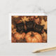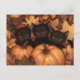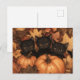 Vattenfärgsillustration av en svart kattunge med bakgrund av höst löv och pumpor.