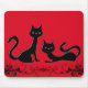 Styrt musknapp med två vackra svarta kattungar tecknad mot röd bakgrund.