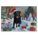 En helgdag med hjärtslitande hund i snö, som bär en julhatt och omges av färgfulla presentlådor. I bakgrunden bygger barn snögubbe bredvid ett Julgran som är täckt av snö och skapar en glatt vinter under. Perfekt för att sprida helgdag och fånga julens magi.