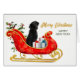 På det här Helgdag sitter en svart Labrador Retriever-Hund i ett dekorativt glatt från söt och guld. Vid sidan av hund är paket bundet med färgstarka bögar, och bakom slummet är det grovt med röda bär. Skripttexten i guld vid högerna säger "GOD JUL" och anpassningsbarna är i grönt. All text, inuti och ut, kan lätt ändras till vad du vill. Du kan se mer bilder, liksom andra bilder, på Hund Village.