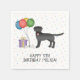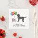 Utformning av matlagningsmatemat med Desteis ursprungliga tecknad illustration av en söt, svart, jacka färg Labrador Retriever-hund. Bredvid hund finns det färgstarka födelsedagsballonger som är bundna på ett hund ben och en lila och gult färg. Bakgrunden har en lekfull mönster av färglösa pastellkonfetti på vit bakgrund. Det finns också ett anpassningsbara textområde.