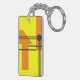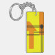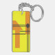 A bold abstract composition featuring a bright yellow background layered with large orange geometric forms, including rectangles and angular shapes. Black elements create strong contrast: parallel straight lines, both horizontal and vertical, intersect with a thick bar and a thinner one. A solid black circle acts as a focal point, connecting with multiple parallel lines. The overall design expresses a sense of structured motion through the interplay of simple geometric forms.