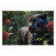 Black Panther - Melanistic Jaguar i gröntens djungel med röda blommor AI art. X267
