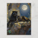 A black panther themed postcard to say hi and keep in touch with family and friends. On the front is an illustration of a majestic black panther with fur like molten black and gold, laying on a cliff ledge bathed in ethereal moonlight. Intricate carvings adorn crumbling stone pillars, and bioluminescent flora casts a soft, otherworldly glow. The scene is rendered in a rich, textural oil painting style with thick, .