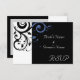 Dold och slående modern contemporary, svarta bröllopsinbjudningar med vita och blåa kornblommor, med delikat snurrande rulla löv bakgrund. Anpassa onlinen med bröllop-informationen.