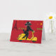 Roligt pudel-kortet för att skicka dina vänner har en svart pudel på ljusröd bakgrund med Eiffel Torn.