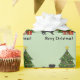 Desteis ursprungliga tecknad illustration av en söt svart jacka hund av färg Pug. Hund står vid ett festligt Julgran med röda prydnadsföremål och gult, en vit pärlträdgård och en gult stjärna på träd. Det finns också två inslagna presenter vid träd och det finns ett textområde som nu lyder: "God jul!". Bakgrunden till färg är ljust grönt.