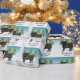 Desteis ursprungliga tecknad illustration av en söt svart jacka hund av färg Pug. Hund placeras på en vinterscen med tre gröntar för träd. Bakgrunden är en blå till vit övertoning som ge kallets vintag. Det finns ett anpassningsbara textområde som nu lyder: "God jul!" tillsammans med ett eget namn.