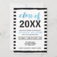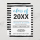Vänner och familj i inbjudan till en Studentfest med den här inbjudan till chicen svartvitt rand som innehåller ord "Klass av" i blå vattenfärg och du kan lägga till det aktuella studieåret i fet svart teckensnitt. Anpassa den här inbjudan genom att ersätta platshållartexten i mallen. Om du vill ha fler alternativ, till exempel att ändra teckensnitt, klickar du storlekt på knappen "Anpassa". *Observera att Zazzle Watermark som visas i zoomförhandsvisningen INTE visas på den slutliga tryckta produkten © Rosewood and Citrus