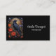 Affärskort med en svart kråka på gren omgiven av röda blommor. Coola gothisk vibe.