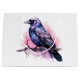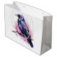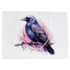 Mjuk väska med en svartvit kråka med lila rosa vingar. En rosa vattenfärgad platta bakom denna vackra mystiska fågel.