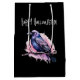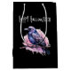Mjuk väska med en svartvit kråka med lila rosa vingar. En rosa vattenfärgad platta bakom denna vackra mystiska fågel.
