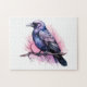 Ett pussel med en svartvit kråka med lila rosa vingar. En rosa vattenfärgad platta bakom denna vackra mystiska fågel.