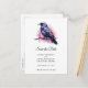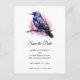 Spara datumvykortet med en bild av en svart kråka med lila rosa vingar. En rosa vattenfärgad platta bakom denna vackra mystiska fågel.
