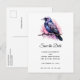 Spara datumvykortet med en bild av en svart kråka med lila rosa vingar. En rosa vattenfärgad platta bakom denna vackra mystiska fågel.