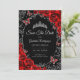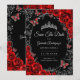 Black red and silver Quinceanera celebration Save The Date card. Features, script font, butterflies, watercolor roses and tiara. Perfect for an elegant princess style glam celebration. Personalize with your own details. Printed Zazzle cards or instant download digital printable template.