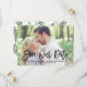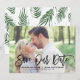 Snyggt spara datum meddelande med penselmodern kalligrafi med grönt löv mönster. Detta kommer att vara en perfekt för att spara datumet för vår och sommarens bröllop. Du kan anpassa baksidan genom att lägga till ditt eget mönster eller lägga till ett annat foto.
