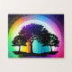 Denna förtjusande sammansättning avslöjar en infångande bandindustri där silhuetterna av det stora träd står höga mot en vibrerande duk av regnbåge. Den fångar det väsentliga i naturens harmoni och bjuder in tittaren till en värld där fantasi frodas.