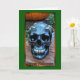 Det här Halloween-kortet har en mörk- och keramikdesign som säkert kan tilltala fläkt om makabren. Centralbilden är ett detaljerat, svart skalle med en glansig, nästan metallisk avsluta. Skallen är försedd med små, ömtåliga ben och sprickor fyllda med ett guld-liknande ämne, ge ett unikt och gammalt utseende. Inställningen verkar vara en rustik utomhusscen, med skallen vilande på ett träträ yta och en aning rått, naturligt struktur läggs till i designen.