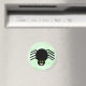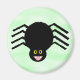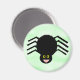En fläcksvart spindel med åtta ben, gult öga med stora svarta elever och munnen som visar sina fangor.