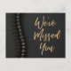 Denna design har en elegant svart och guld ryggradsgrafik på svart bakgrund tillsammans med koordinerande kalligrafisk text som säger, "Vi har saknat dig." Baksidan av kortet har vårt meddelande om återkallande/reaktivering, men du kan enkelt redigera/ändra meddelandet för att passa dina behov.