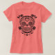 Sockerskallekonstruktionen i Day of the dead är omgiven av fyra stambaserade ro. Skallen består av svart linjer och dekoreras med strömmande snurrar och mönster. Det cirkulära ögonen består av blompedaler med fem punktstjärnor inuti. En enda stjärna visas vid designen grund och förankrar detta symmetriska mönster. Den här enkla men elegant sockerskallen gör en snyggt skjorta.
