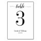 En kalligrafi för svart smak för ord, "bord", med talet i ett stort romerskt teckensnitt som kan anpassas med vilket bordsnummer som helst. Bilden visas på båda sidor av detta kort.