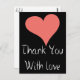 I denna moderna teknikdag håller handskrivet tackkort på att bli en borttappad konst. Den här söta och enkla vykortet har ett stort rosa hjärta med Tack, kärlek tryckt i ett vitt, lättläst teckensnitt som markerats mot en jet svart bakgrund. Baksidan av vykortet är tom för ditt personliga meddelande. Tack för att vykorten är underbara för... * Bröllop / möhippor / förlovningsfester * Vänskapliga handlingar * Företag * Uppskattning för gåvor * Personanteckningar * Fundraisers / välgörenhetsorganisationer * Stationerigåvor - knytkort tillsammans med ett band rullan ner för att visa andra vykort som du kan använda.