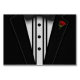 En svart tuxedo med en båslips och röd ros.