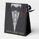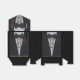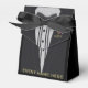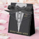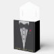 En glimmad svart tuxedo-presentlåda med röd ros gör en mycket elegant design för en bröllopsförmånslåda, för födelsedagar, bachelor och möhippor och andra speciella evenemang.