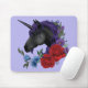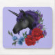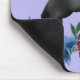 En svart enmajsprofil med rött, lila och blåa blommor mot bakgrund av lätt lila