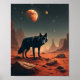 Svart Varg under Alien Himmel - En solitär svart varg står på ett ött, rödhuggt landskap, och dess piercing gult ögon fastsatt på tittaren. Himmel är en flotta som är prickad med dubbla stjärnor och en stor, glödande orange måne. Flera mindre himmelska organ är synliga, vilket antyder en främmande värld. Vargens silhuett står emot den pulserande röda sanden och den hårda terrängen och skapar en känsla av isolering och mysterium.