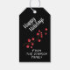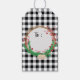 Ett paket med moderna Juletiketter att knyta till presenter. Framsidan har en svart och vit Buffalo-kontroll mönster med en rustik krans. Baksidan är en faux chalkboard med en gren av röda bär. Anpassa dem med ditt eget Helgdag-budskap och namn. © ArianeC Illustrations-Alla höger reserverade