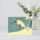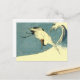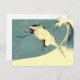 Det här vykortet har en svart och vit kranfågel som flyger över havet med stor kranvåg mot blå bakgrund.