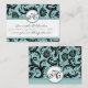 Bröllopsinbjudningar för Aqua Damask, svarskort, insättningskort, Monogram New Storzes Elegant Vintage Black Damask Swirls Aqua Bassäng Blue Ribbon Bröllopsinbjudan