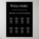 A classic black background. Personalize and add the name of the bride and groom, add your guests names. White text.