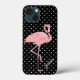 Lägg till en dekorativ stil till din iPhone, med den här roligten flamingo fodral. Bilder av en svart och vit polka punkt mönster som bakgrund, med blek rosa flamingo, i mitten. Anpassa den rosa texten, i grund, för dig själv eller som en roligt presentidé.