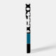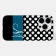 En giftig och fetstilt grafik. Stora svarta och vita polka dots med ett blått monogram på högerna.